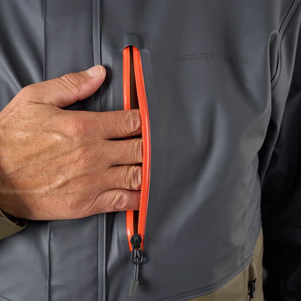 Built for the die-hard angler who fishes through it all, the Tourney Pro Jacket delivers uncompromised, complete waterproof protection without sacrificing performance or price. Crafted with flexible 100% PU-coated polyester that moves with you and simply will not wet out, this jacket shrugs off blood, slime, and sea spray while integrated 3mm neoprene cuffs lock out water when the action heats up. Pit zips offer ventilation and easy access to bibs or waders, while a snag-free adjustable hood and Grundens' Storm Front Placket provide added defense when you're running hard into wind and weather. Whether you're in for long choppy boat runs or casting into sideways rain, the Tourney Pro is your professional grade shield-purpose-built to keep sport anglers dry, clean, and fully focused on the bite.
