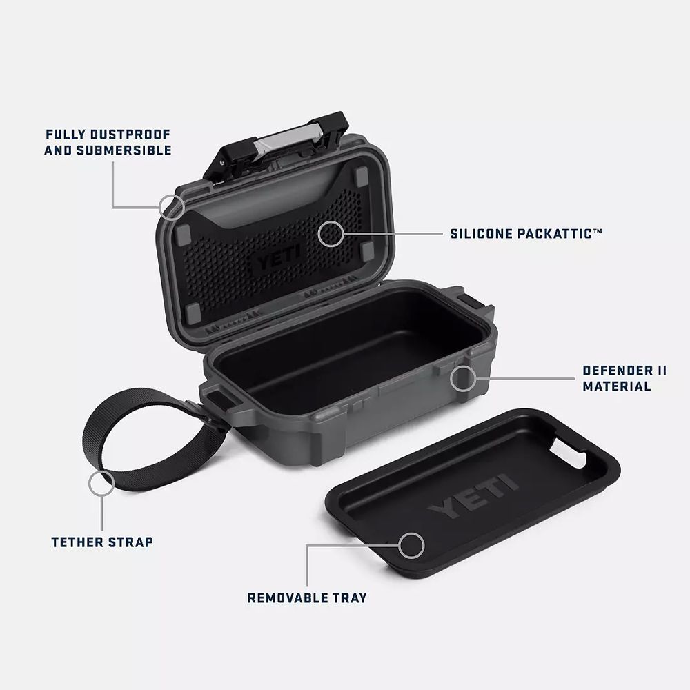 Meet the newest, most compact member of YETI nearly-indestructible Loadout GoBox family. Designed with a rigid and weather-resistant exterior, the Loadout GoBox 1 Gear Case houses the items you can't leave home without. The removable tray and Silicone PackAttic accommodate most phones and keep slimmer gear, such as car keys, credit cards, park passes, and fishing licenses safely in stow and easy to access. The ultra-durable tether strap easily loops and locks around the equipment you need it to, think saddles, skiff grab rails, or side ATV doors, and keeps the essentials on hand when you don't have one to spare. Waterproof, dustproof, and virtually unbreakable, the GoBox 1 is made with the same quality you've come to expect in an all-new, portable size.